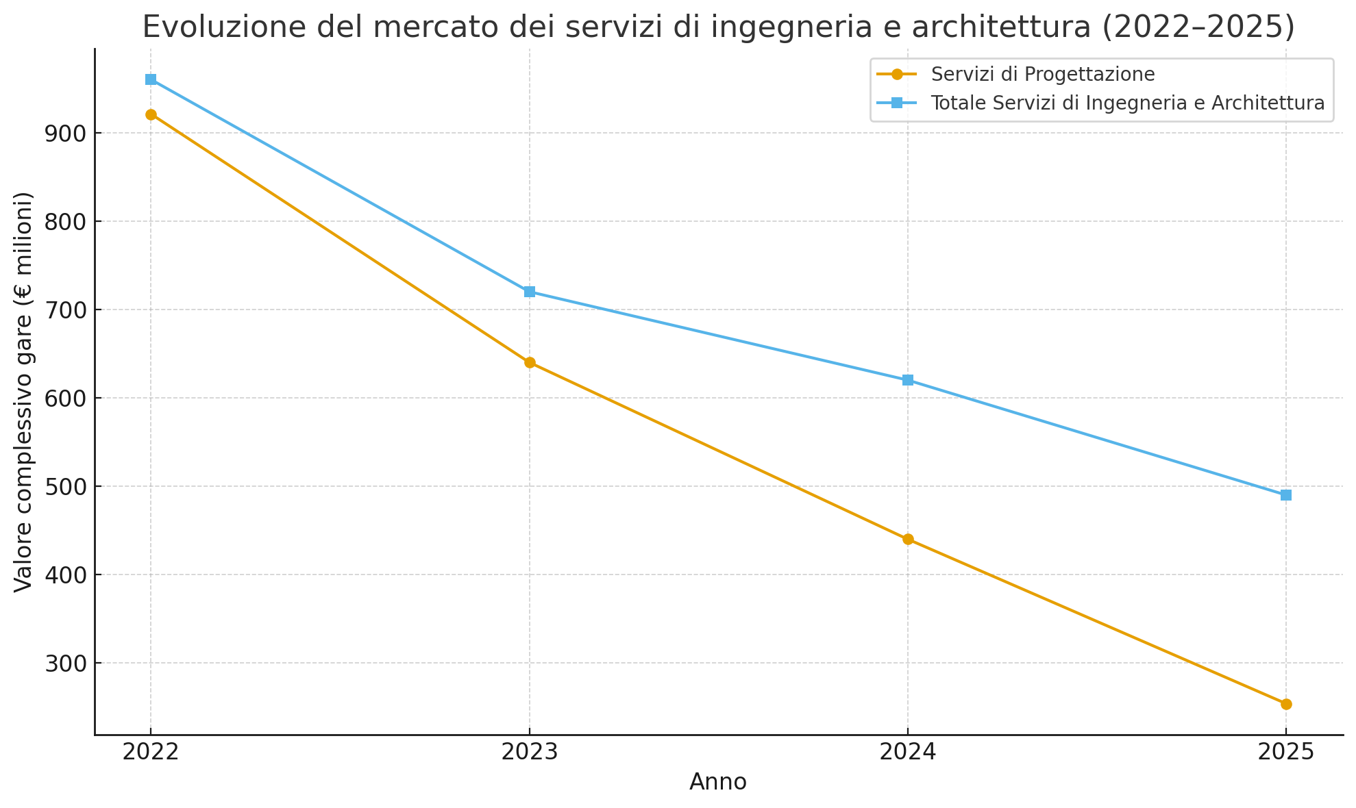 Negli ultimi anni il mercato dei servizi di ingegneria e architettura ha attraversato una fase di forte espansione, trainata dagli investimenti del PNRR e dai numerosi bonus edilizi che hanno stimolato la domanda pubblica e privata. Tuttavia, nel 2025 il settore mostra segnali sempre più evidenti di rallentamento: la spinta straordinaria generata dai fondi europei e dagli incentivi fiscali si è ormai esaurita, lasciando spazio a una nuova fase di normalizzazione. Il recente rapporto del Centro Studi del Consiglio Nazionale degli Ingegneri (CNI) fotografa con chiarezza questa transizione, mettendo in luce una contrazione significativa dei bandi e un calo generalizzato degli importi a base d’asta, a testimonianza di un comparto che, dopo anni di crescita eccezionale, deve ora confrontarsi con dinamiche più strutturali e con la necessità di ridefinire il proprio equilibrio economico e professionale.