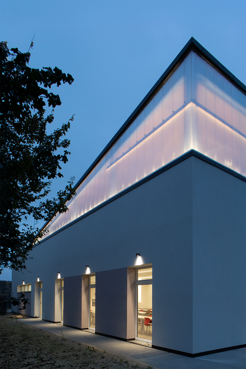 Un intervento che unisce efficienza funzionale e valore simbolico. La “lanterna” in policarbonato retroilluminata trasforma l’edificio scolastico in un punto di riferimento visivo, dimostrando come il laterizio possa dialogare con materiali leggeri in un contesto densamente edificato.