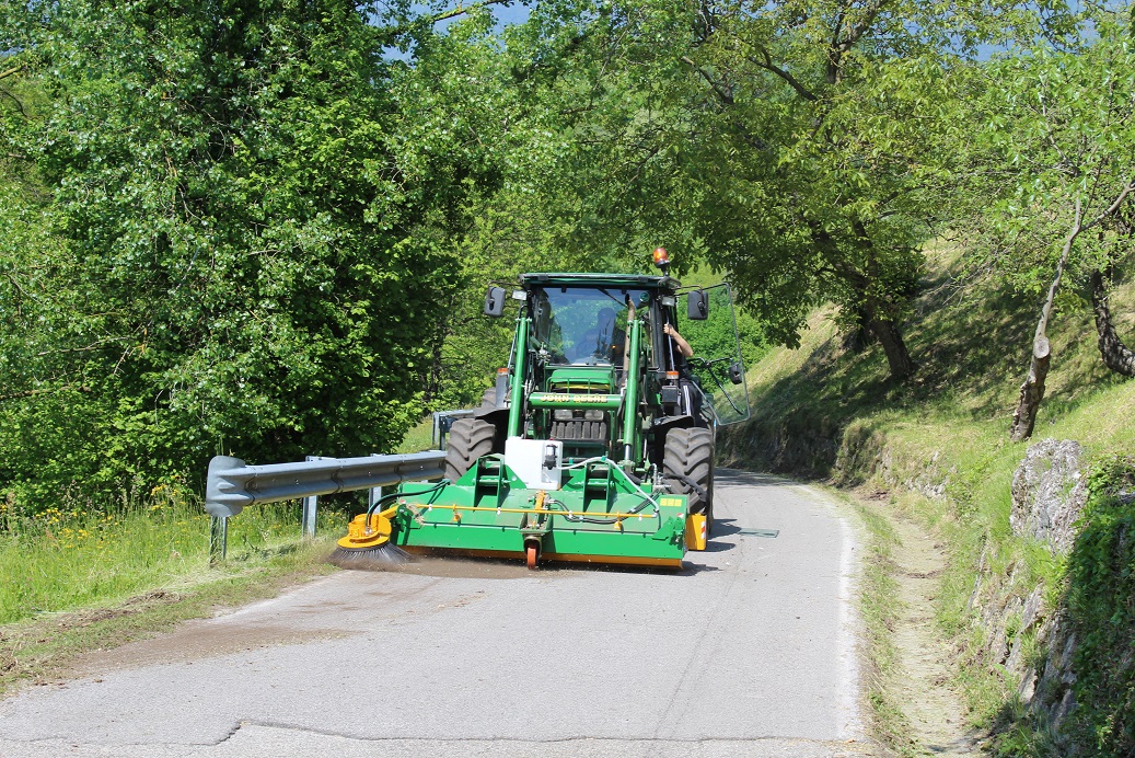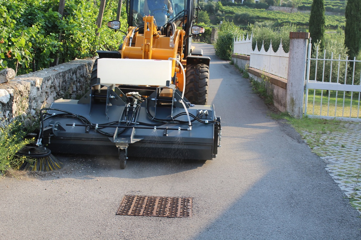 E’ dotata di serie di apertura idraulica della benna, tubazioni per l’alimentazione del circuito idraulico e auto allineamento spazzola-benna. Grazie al sistema trasmissione a catena, il motore, posizionato alto, è protetto sia da polvere e sporcizia, sia da eventuali urti durante l’utilizzo della spazzatrice.