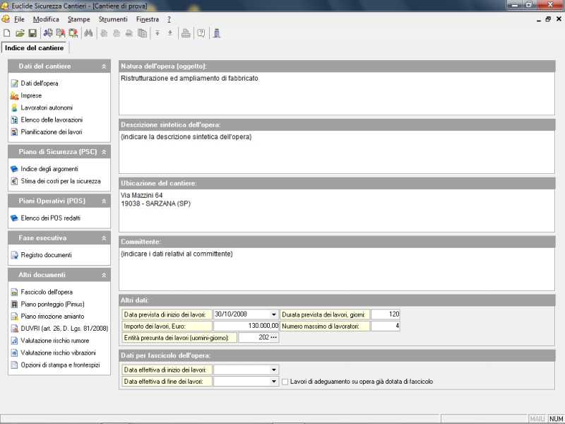 Euclide Sicurezza Cantieri è la soluzione software per la completa gestione della sicurezza nei cantieri edili, in ottemperanza al disposto del D. Lgs. 81 del 9 aprile 2008 (Testo Unico sulla salute e sicurezza sul lavoro) aggiornato sulla base del D. Lgs. 106/2009 e della Legge 88/2009.