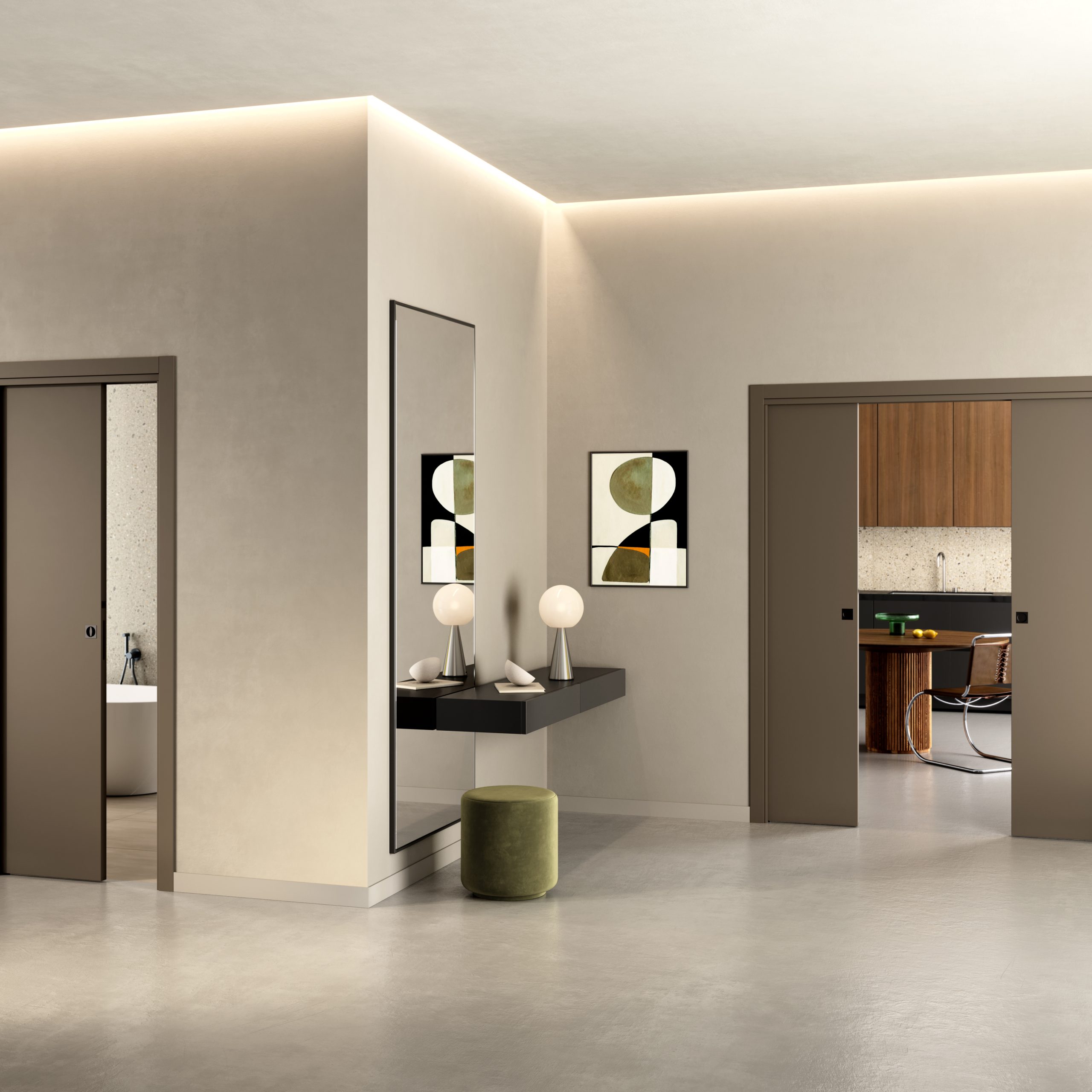 Evolution è l’evergreen di Ermetika. Questo sistema permette di installare la porta interna senza limitare lo spazio adiacente all’apertura. Le sue caratteristiche peculiari sono la semplicità di installazione, la velocità di montaggio e la versatilità di utilizzo, sia nelle ristrutturazioni che nelle nuove costruzioni. Il sistema Evolution per pareti in intonaco e cartongesso è disponibile nei seguenti spessori: