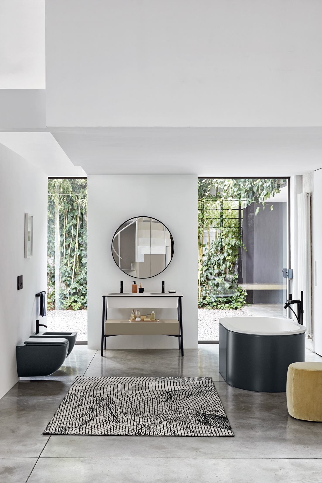 Quattro specchi di cui due capienti specchi contenitori – tondi e ovali – attrezzati con ripiani interni e con scocca in legno laccato nero Matt o bronzo spazzolato completano la collezione, insieme a una serie di elementi come portasciugamani e porta accessori da bagno (porta dispenser, porta sapone, porta rotolo singolo, porta mensola e une versione combinata che integra porta bicchiere e porta sapone).