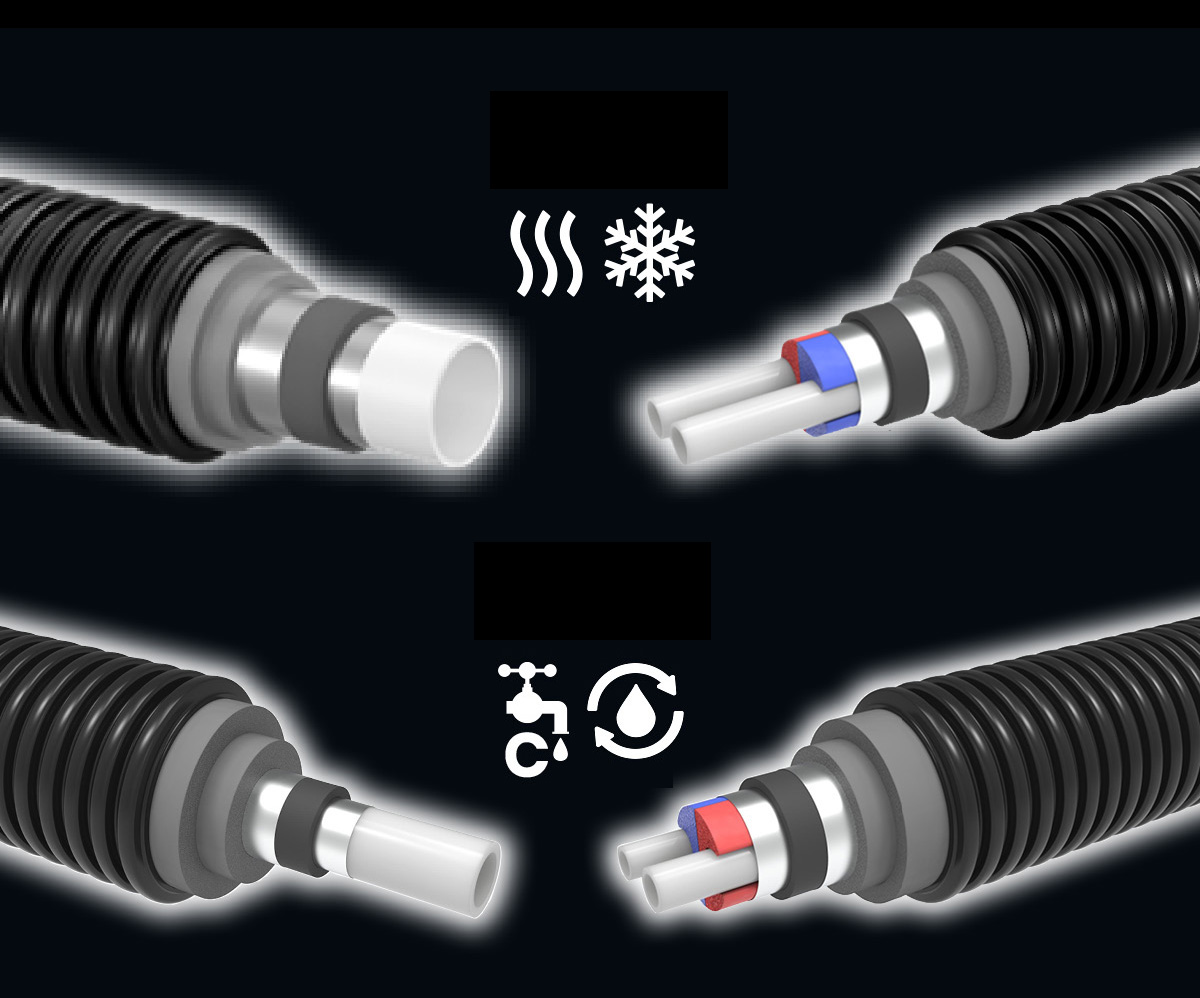 – Twin con due tubi PE-Xa (dimensioni 25-75 mm, 6 bar) per la mandata e il ritorno, individuabili grazie alla doppia colorazione dell’isolante.