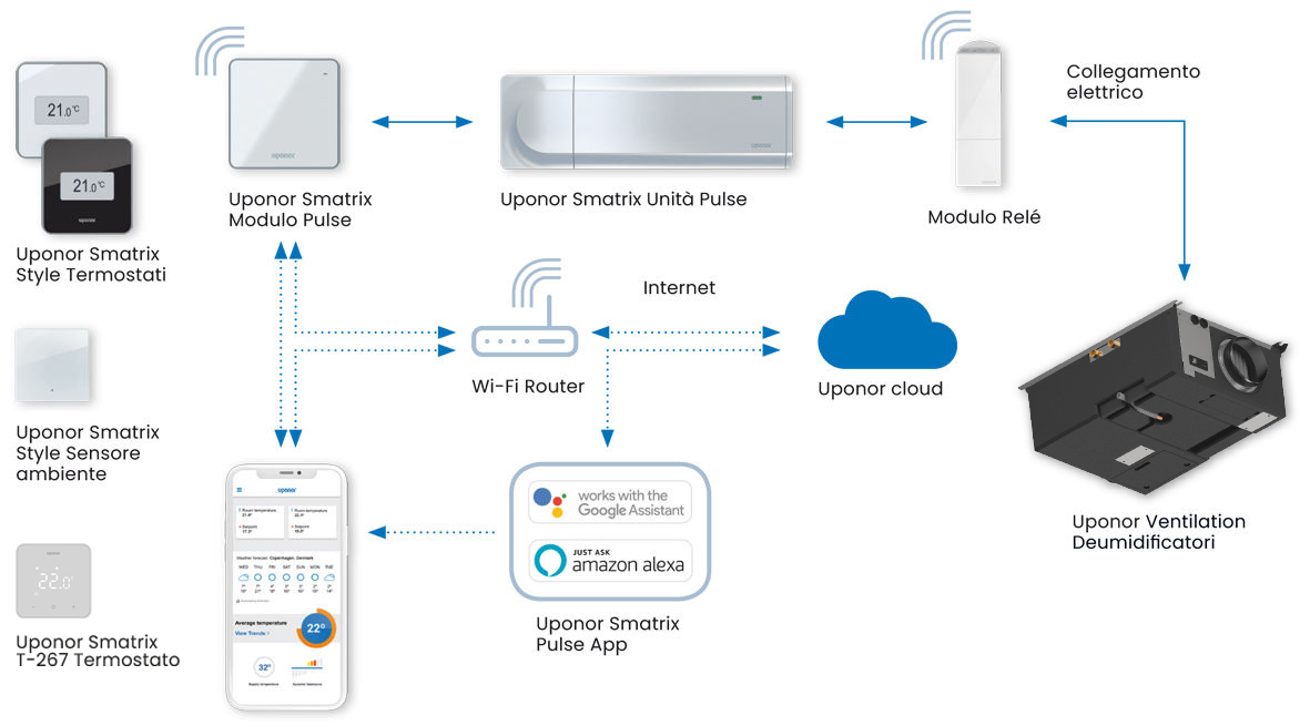 I deumidificatori Uponor Ventilation garantiscono un funzionamento del raffrescamento radiante efficiente e senza rischi in climi con elevata umidità stagionale. Progettati specificamente per sistemi radianti idronici e installazioni a pompa di calore, i deumidificatori Uponor Ventilation utilizzano dati di temperatura e umidità in tempo reale per mantenere un ambiente interno confortevole durante tutto l’anno.